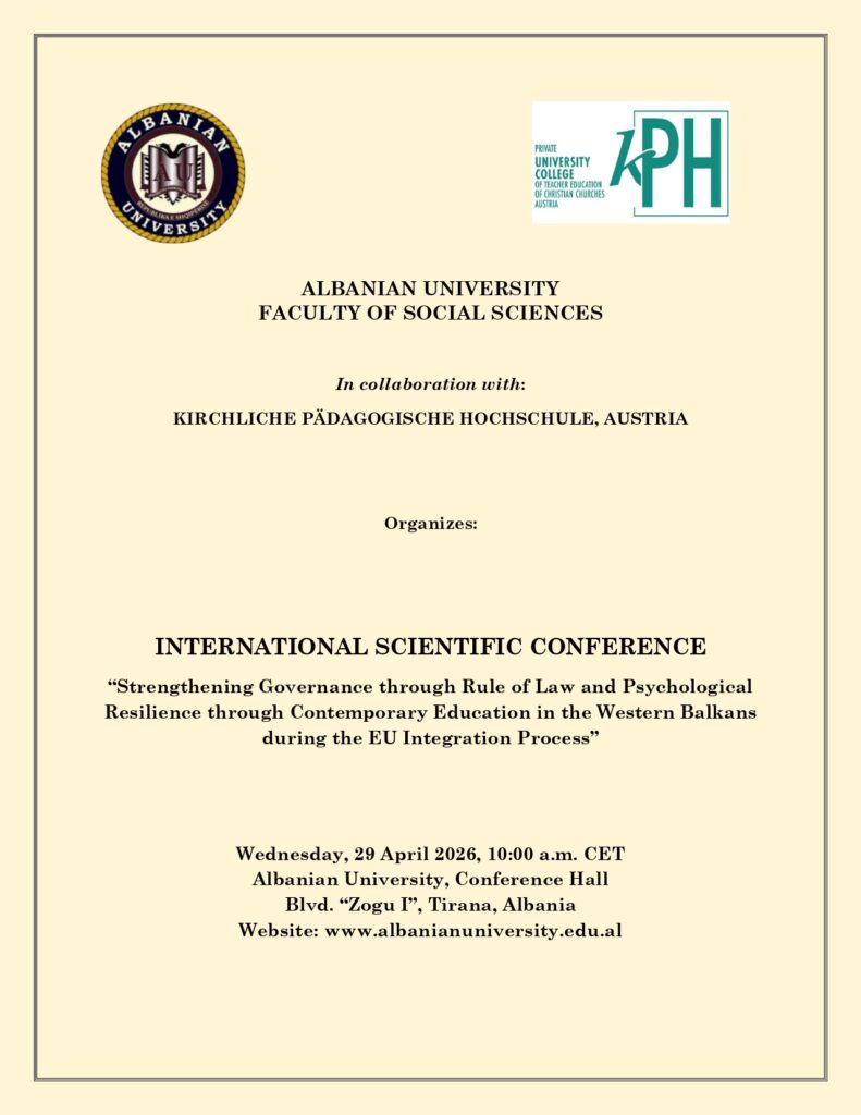 The Faculty of Social Sciences, in collaboration with the Kirchliche Pädagogische Hochschule in Austria, will organize the international conference on the topic “Strengthening Governance through Rule of Law and Psychological Resilience through Contemporary Education in the Western Balkans during the EU Integration Process”, on April 29, 2026.