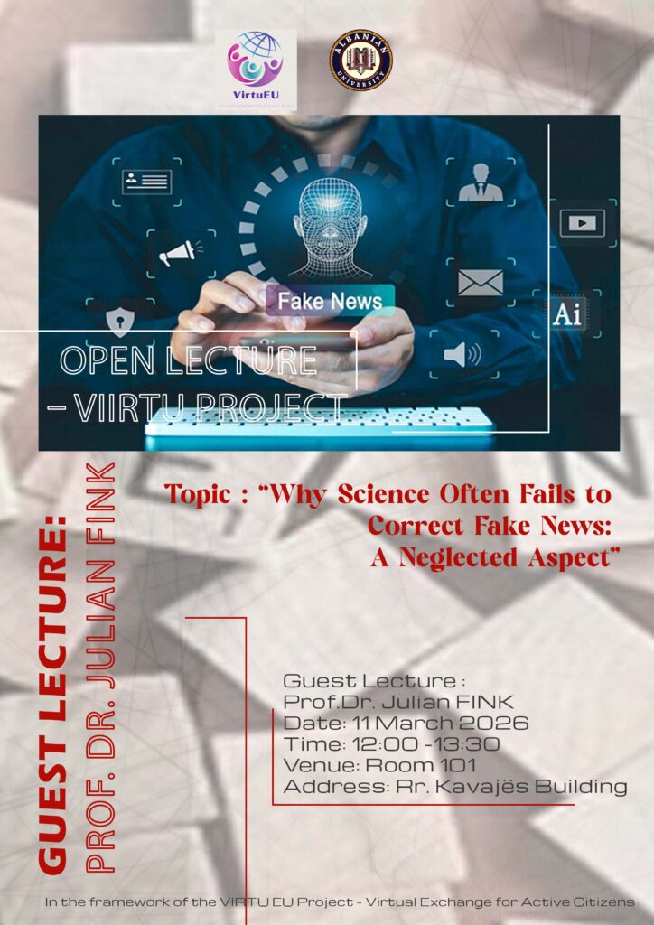 Aktiviteti organizohet në kuadër të Projektit VIRTU EU – Virtual Exchange for Active Citizens dhe do të mbahet më 11 Mars 2026, ora 12:00 – 13:30, në Sallën 101, Godina në Rr. Kavajës.